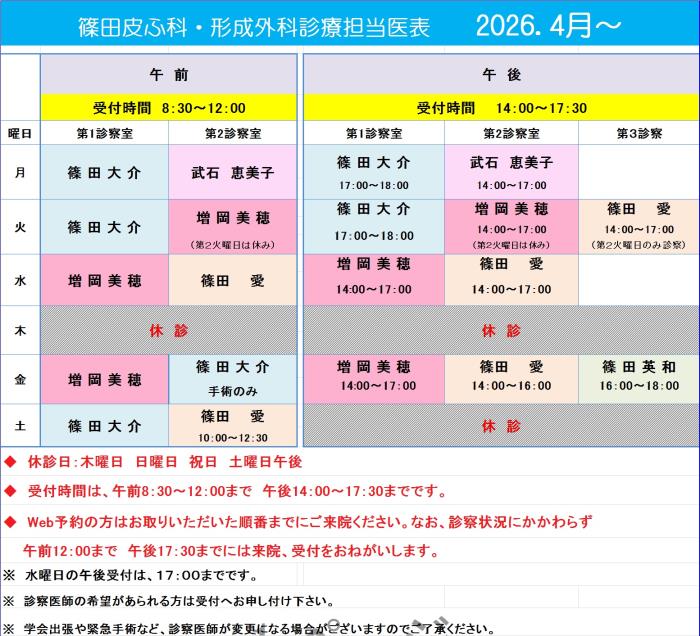 令和8年4月1日より毎週木曜日は、皮膚科・形成外科・美容皮膚科とも休診日となります。